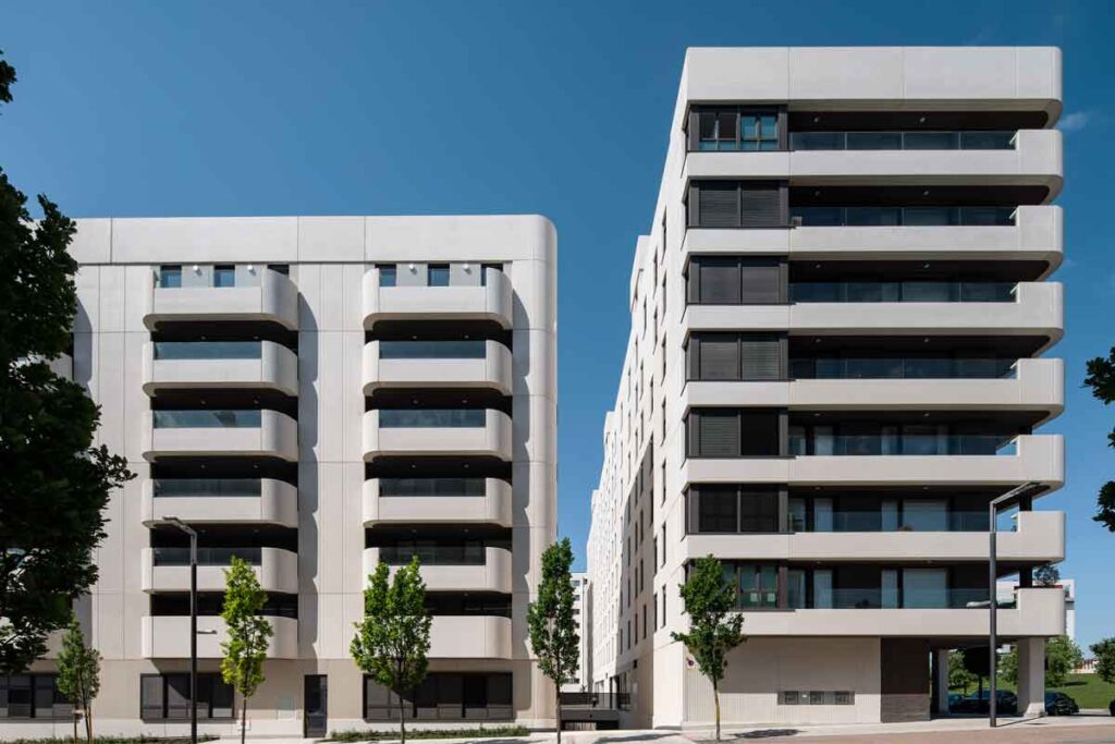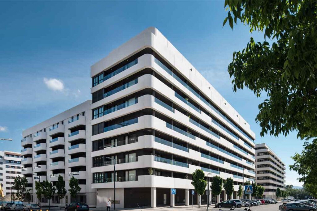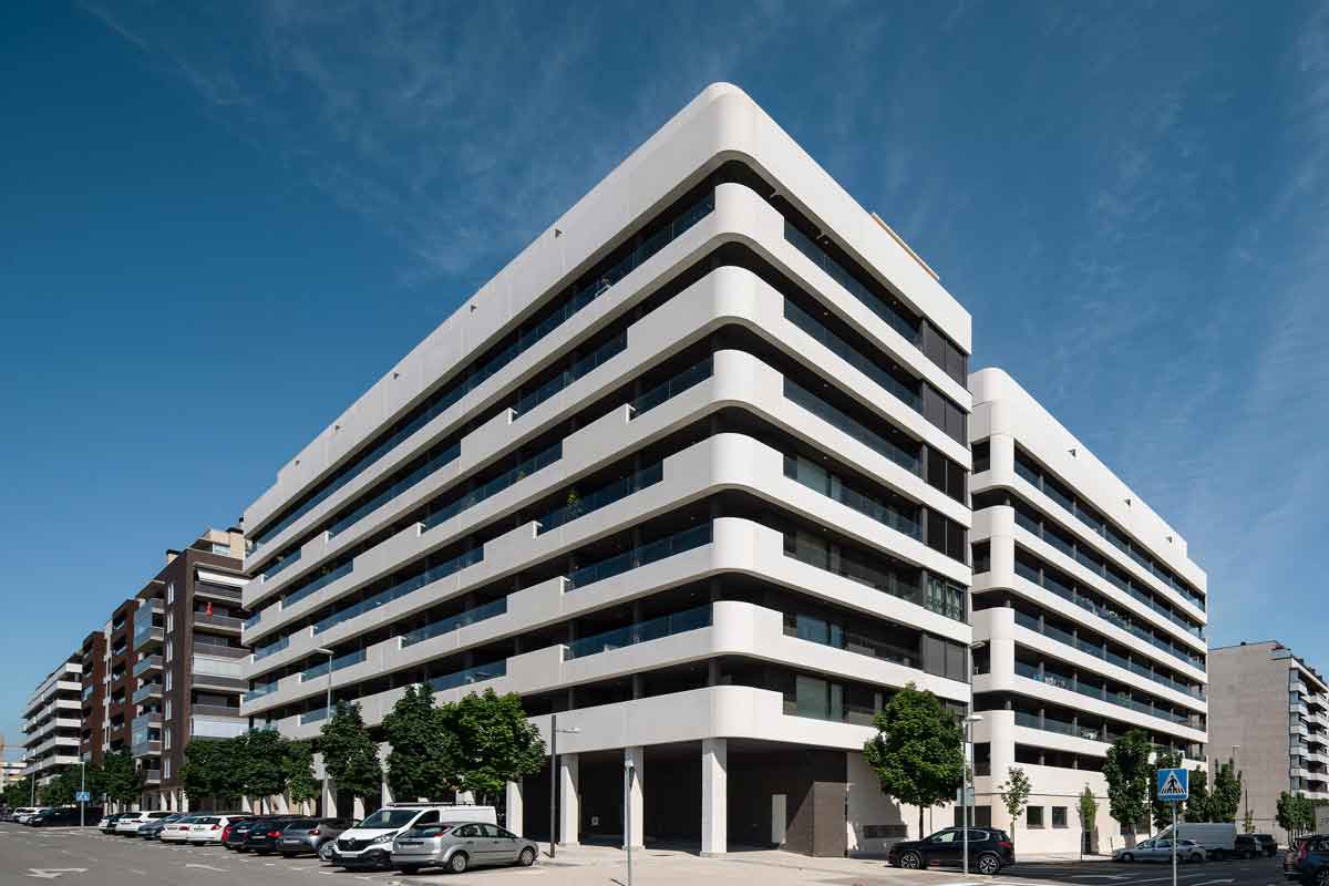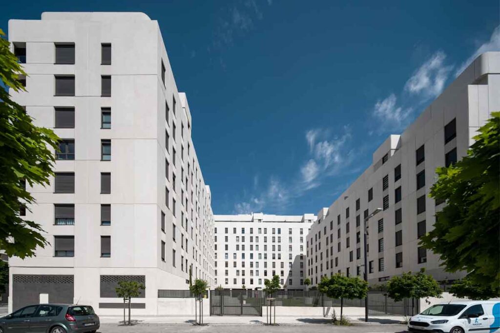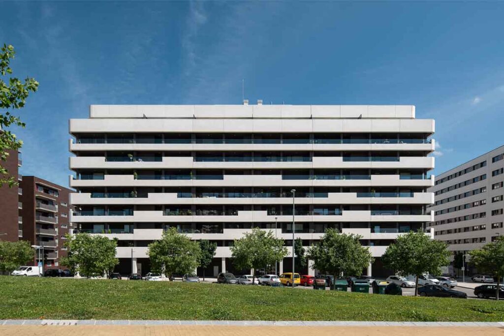 Ejecución de 106 viviendas distribuidas en tres bloques independientes formando una “U”. Sótano de 2 plantas y distribución de las viviendas en 5 ó 7 plantas dependiendo del bloque.